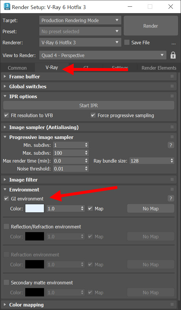 2)3D맥스에서 렌더러를 브이레이로 변경합니다. V-Ray 탭에서 GI environment를 활성화합니다.