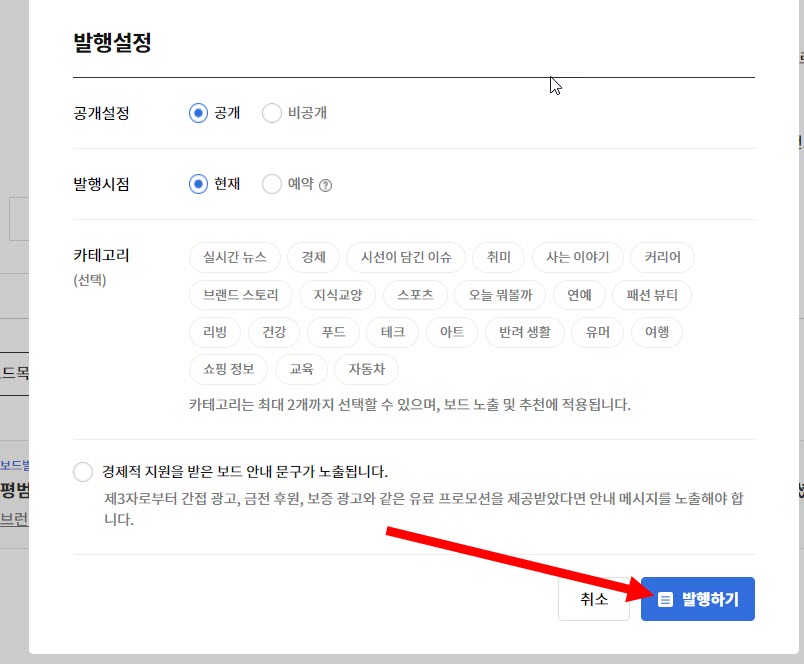 13)공개설정, 발행시점, 카테고리를 설정하고 최종적으로 발행하기를 클릭합니다.