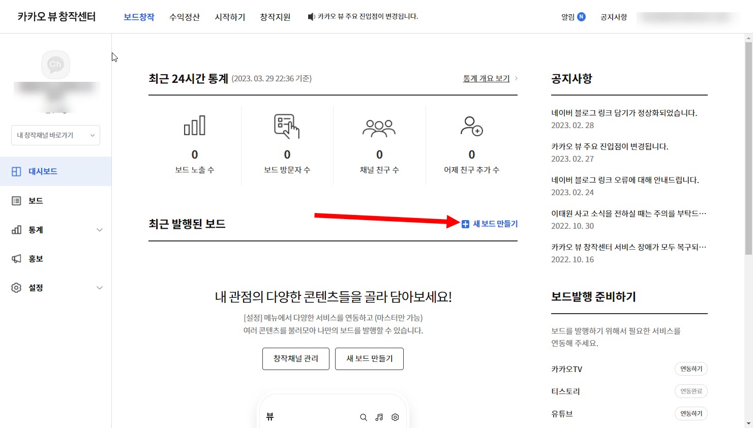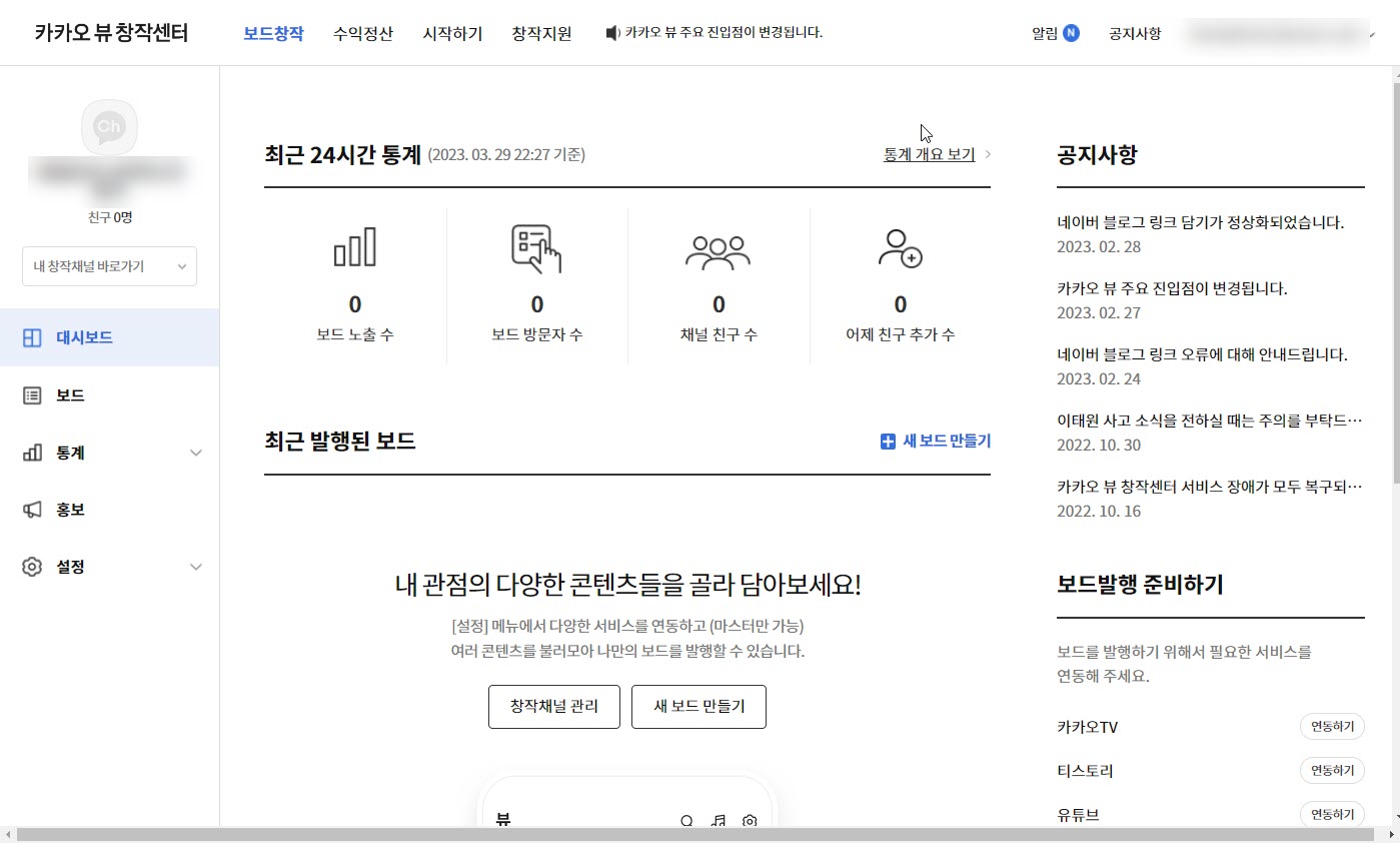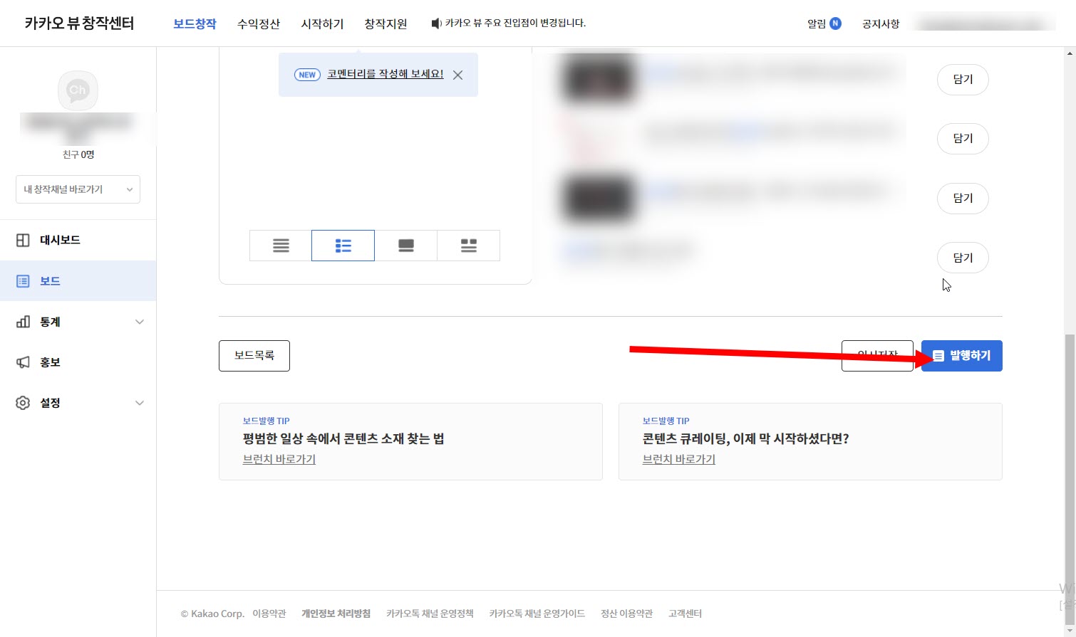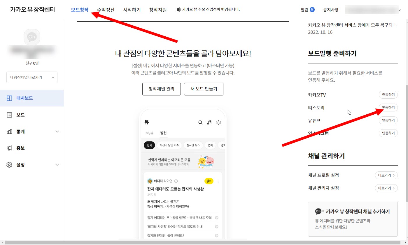 카카오뷰 채널 개설하고 티스토리 블로그 연동하기, 콘텐츠 담기, 보드 발행하기
