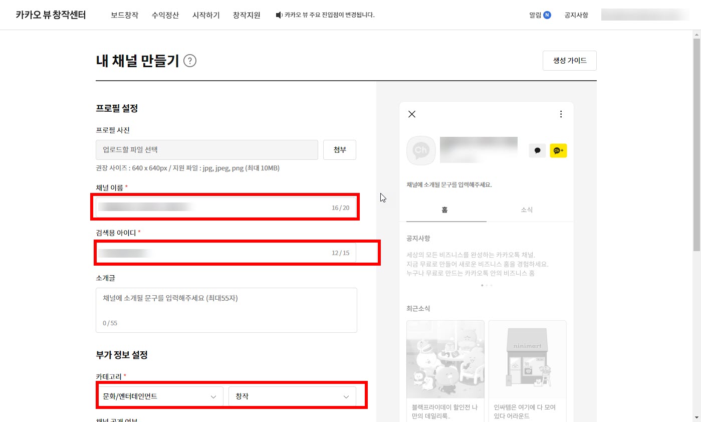 4)프로필사진, 채널이름, 검색용 아이디, 소개글등을 입력합니다.