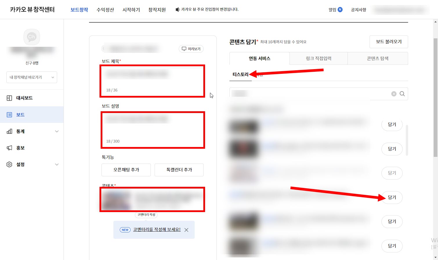 11)보드의 제목, 설명을 입력하고 연동한 티스토리 블로그에서 보드에 추가할 게시글 및 콘텐츠를 담기합니다.