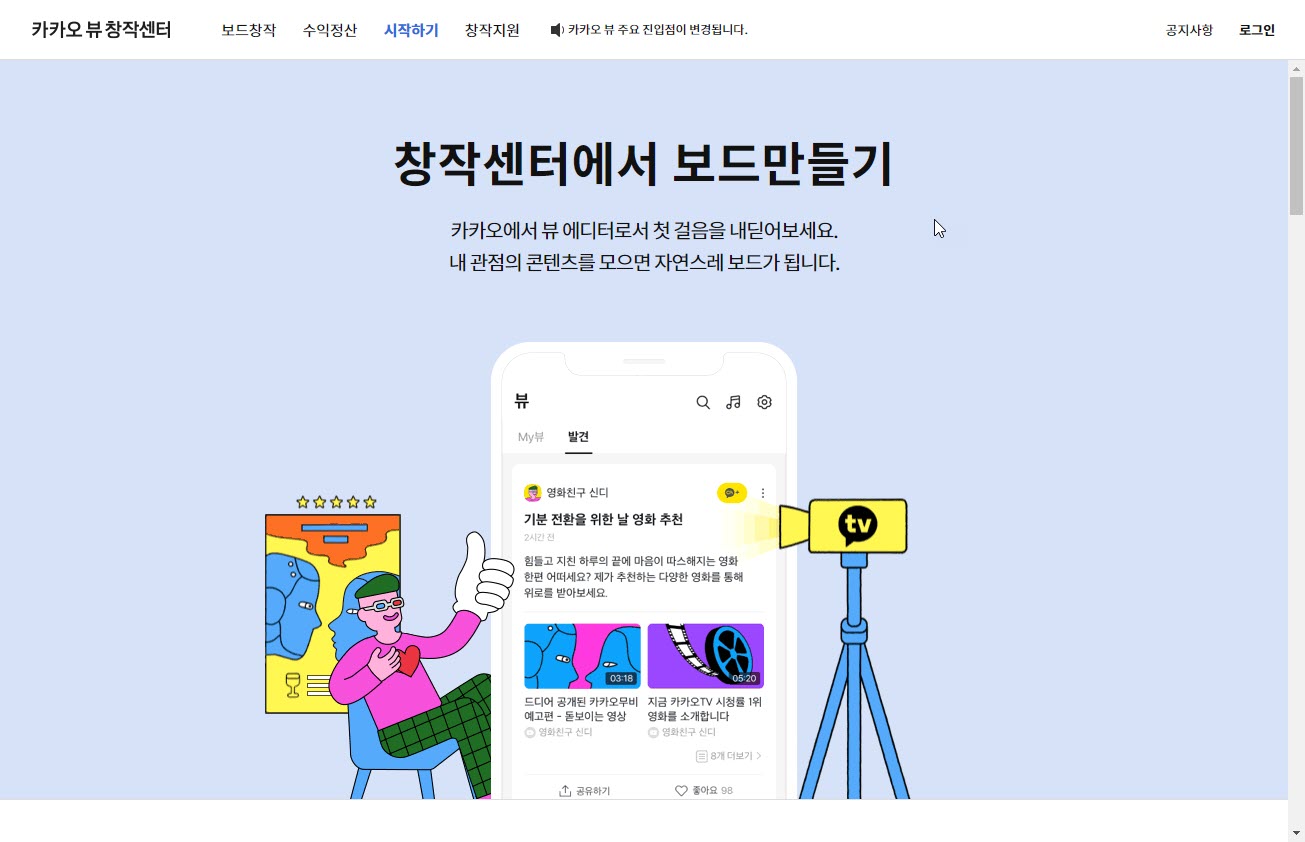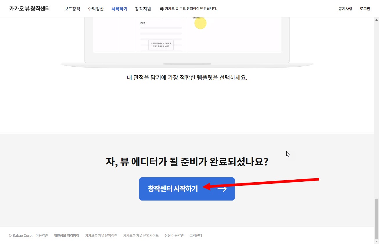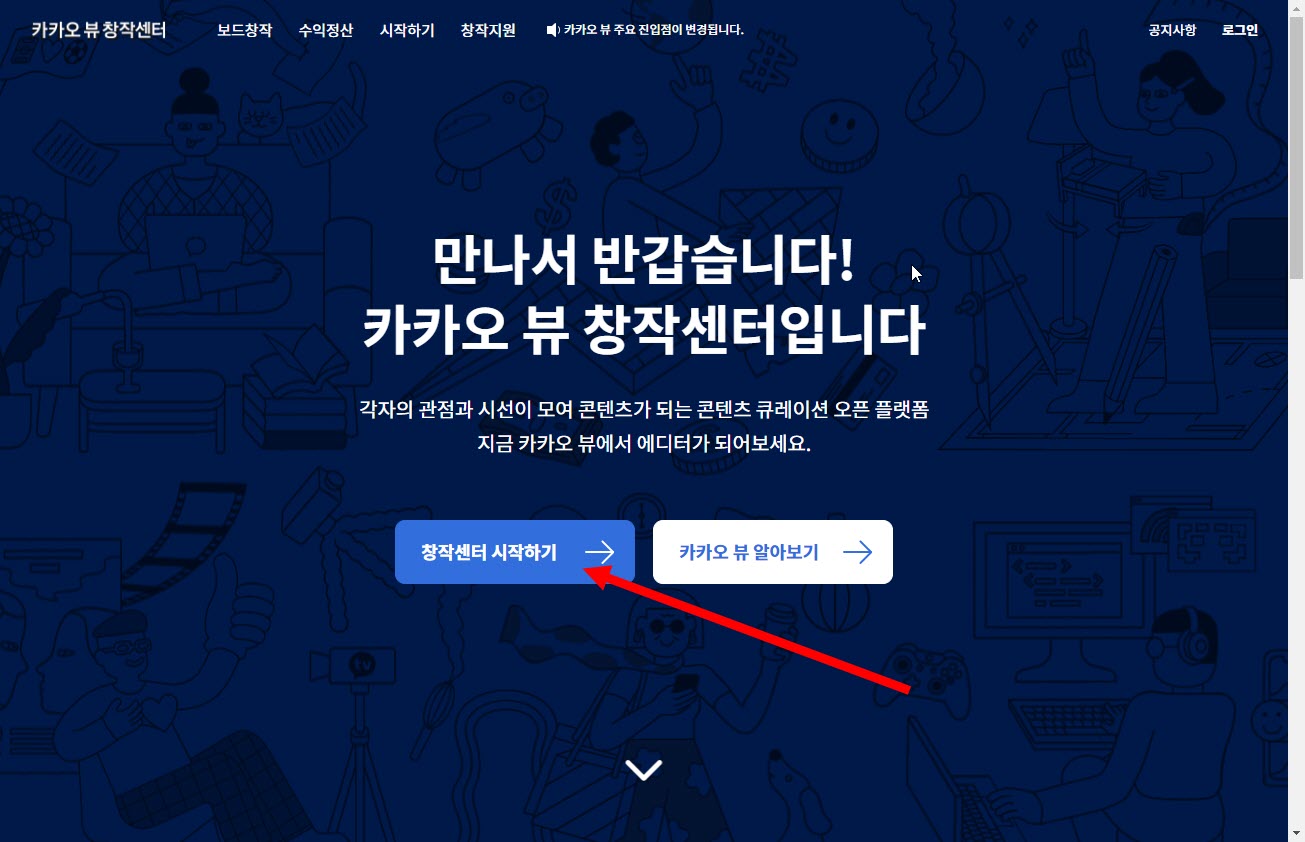 1)아래 카카오 뷰 창작센터 웹사이트에서 창작센터 시작하기로 이동합니다.