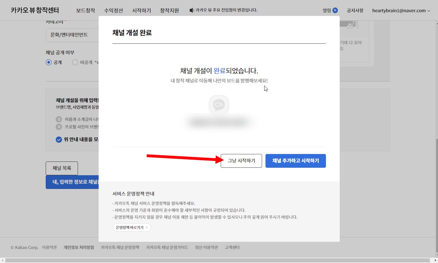 6)채널 개설이 완료되었습니다. 그냥 시작하기로 이동합니다.