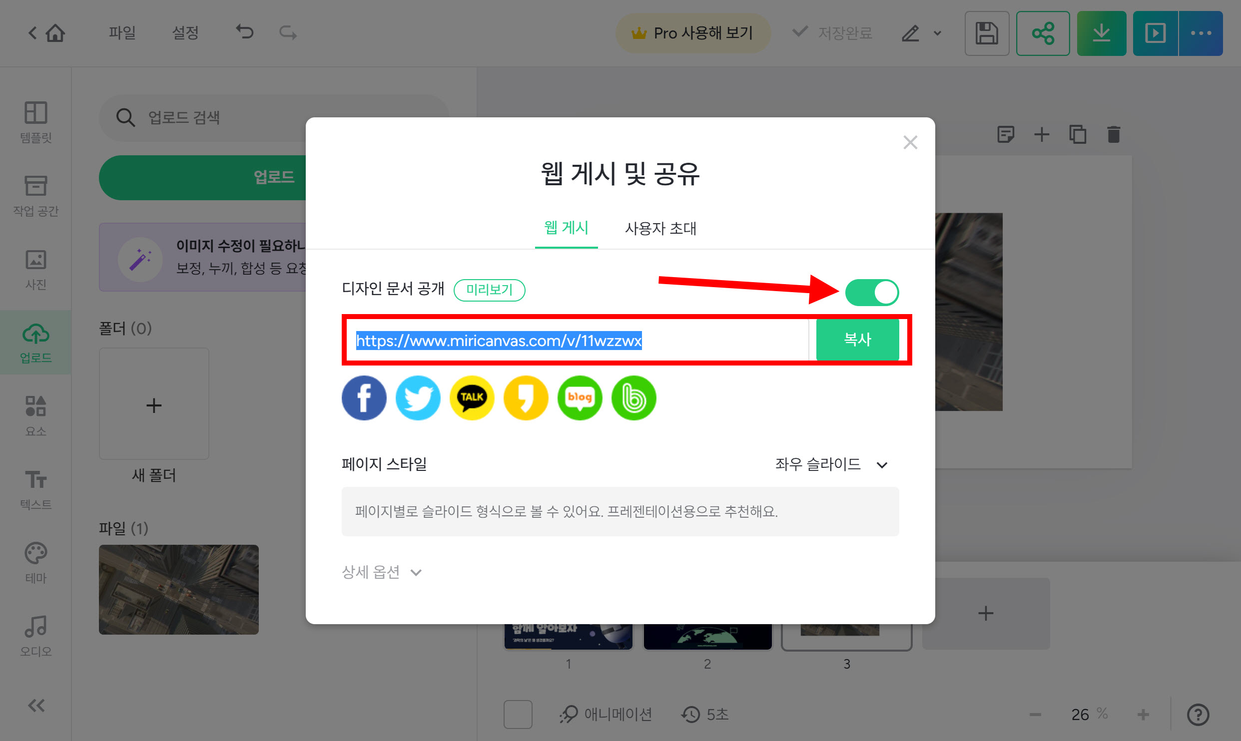 15)공유하기에서 디자인 문서 공개를 활성화하고 웹페이지 링크를 복사합니다.