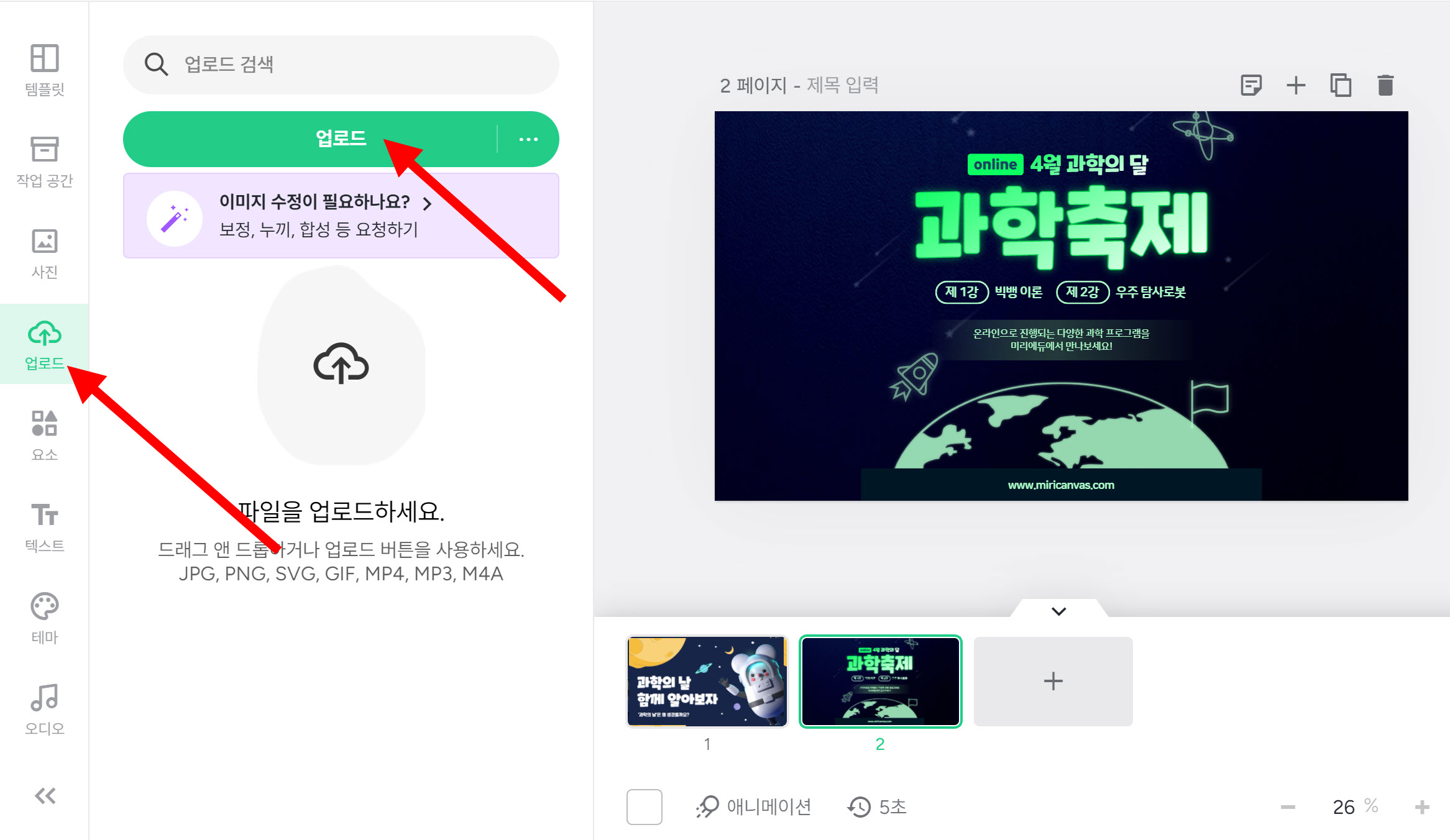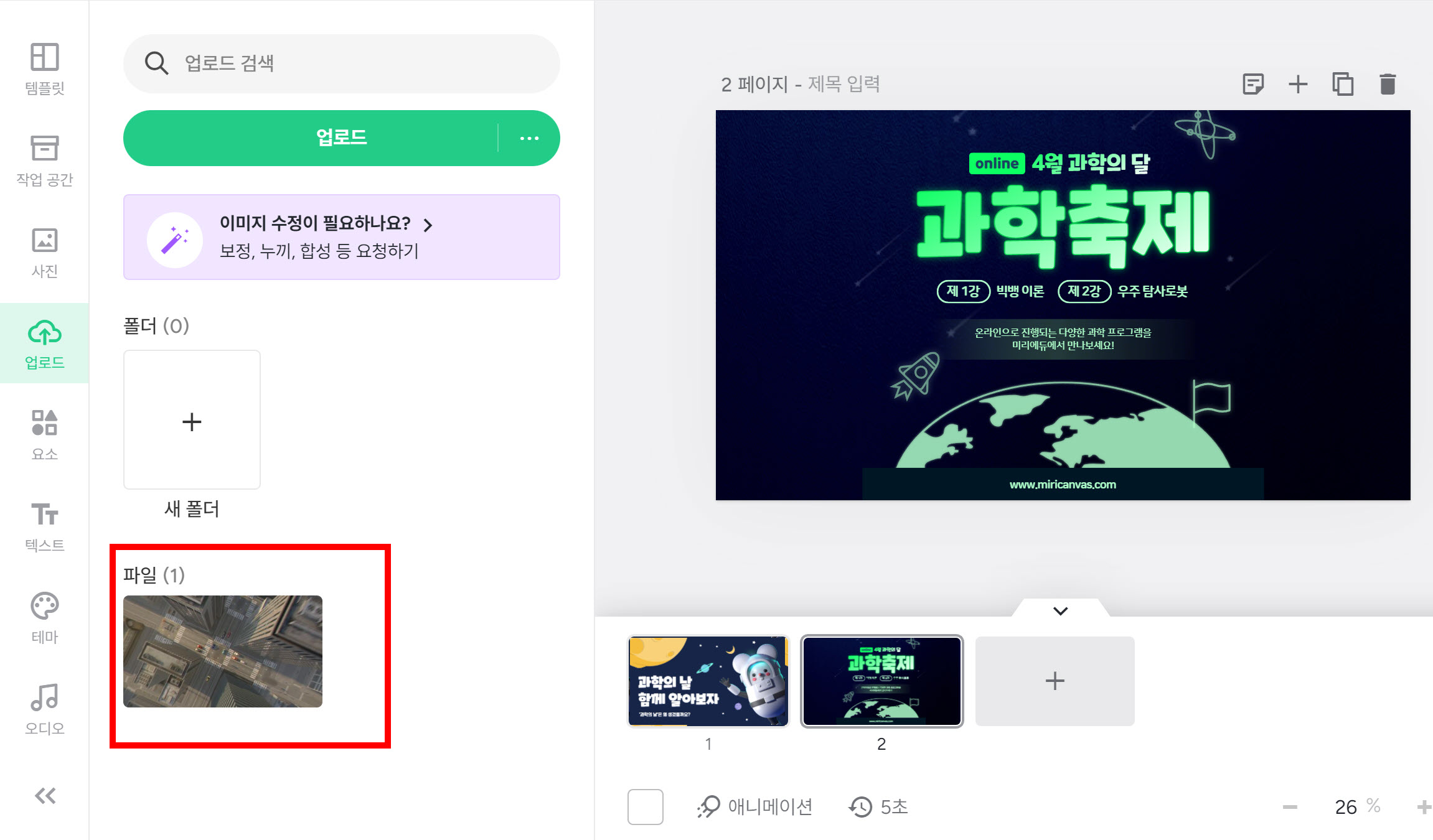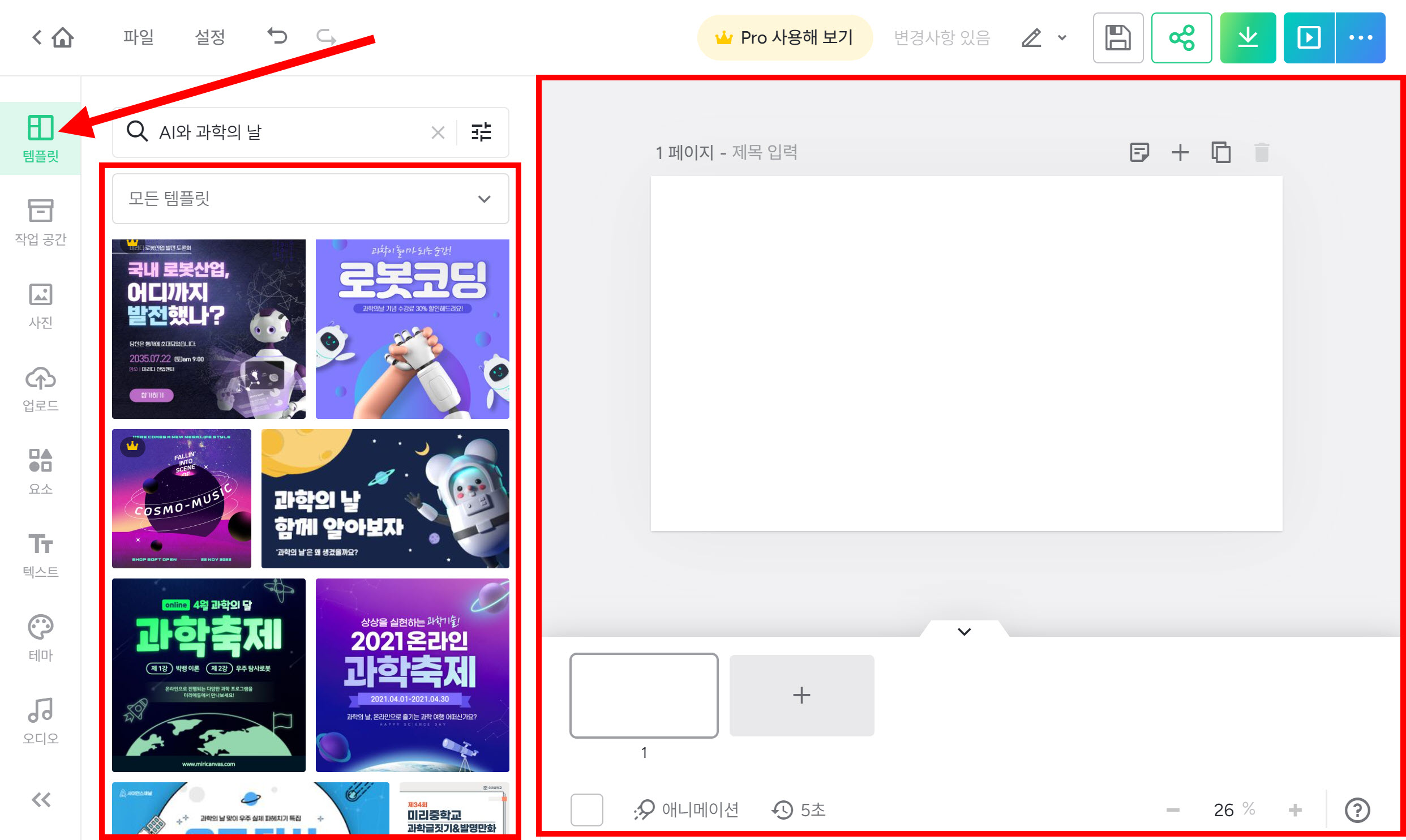 5)좌측에서 페이지에 추가할수있는 유형들을 확인할수있습니다(템플릿, 사진, 요소, 텍스트, 테마, 오디오, 기타)
