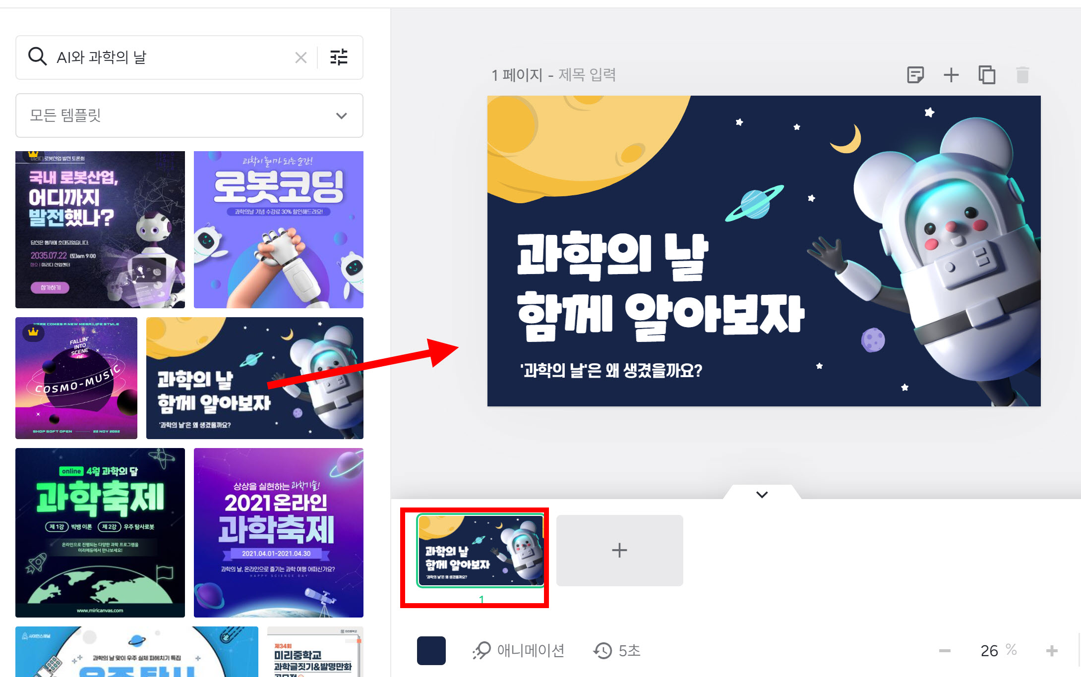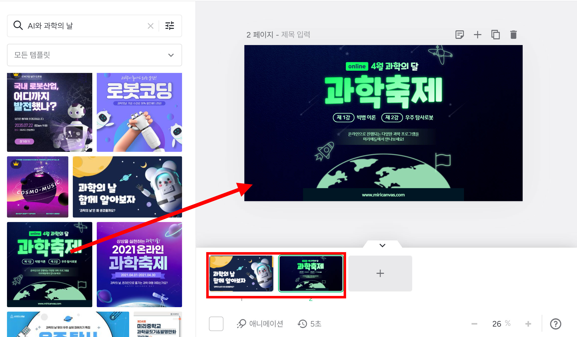 6)템플릿을 선택하고 페이지로 클릭, 드래그합니다.