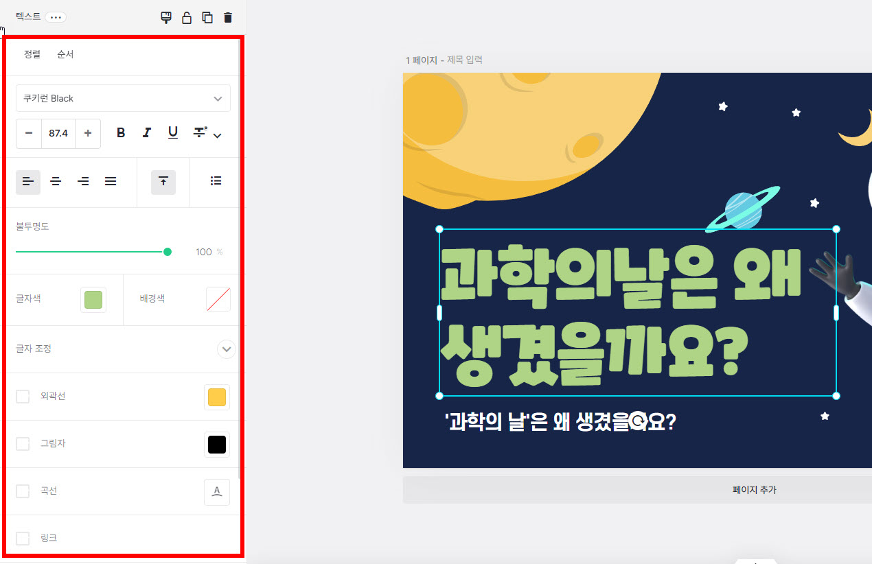 7)템플릿의 텍스트, 비트맵, 일러스트등 요소를 선택하고 수정할수있습니다. 텍스트를 선택하고 글자, 글자색, 불투명도, 외곽선등을 수정합니다.