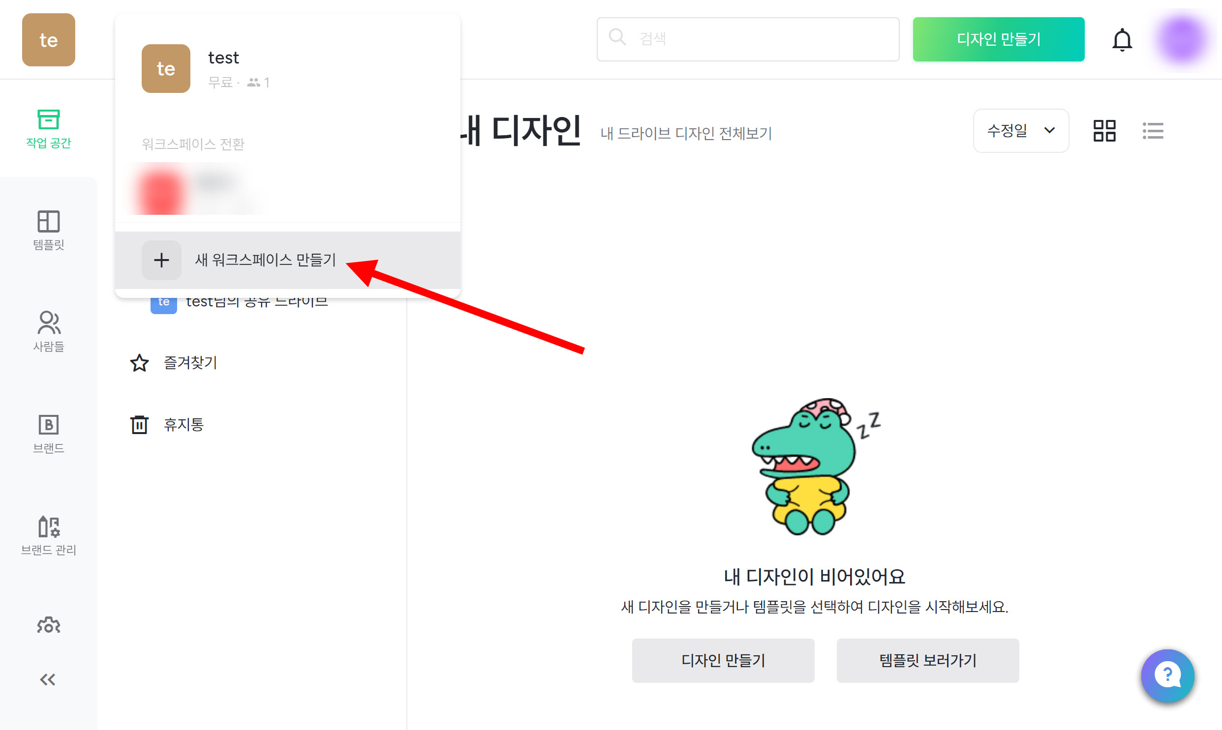 2)좌측 상단에서 새 워크스페이스 만들기를 선택합니다.