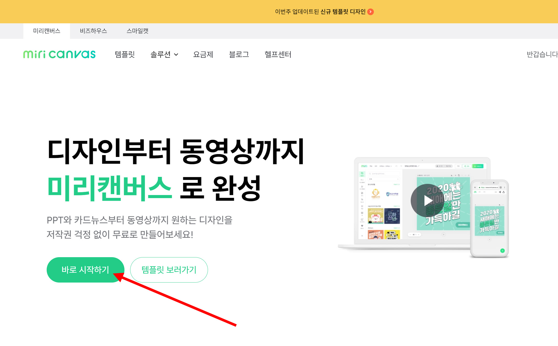 1)미리캔버스 웹사이트에서 계정 로그인하고 바로 시작하기를 선택합니다.