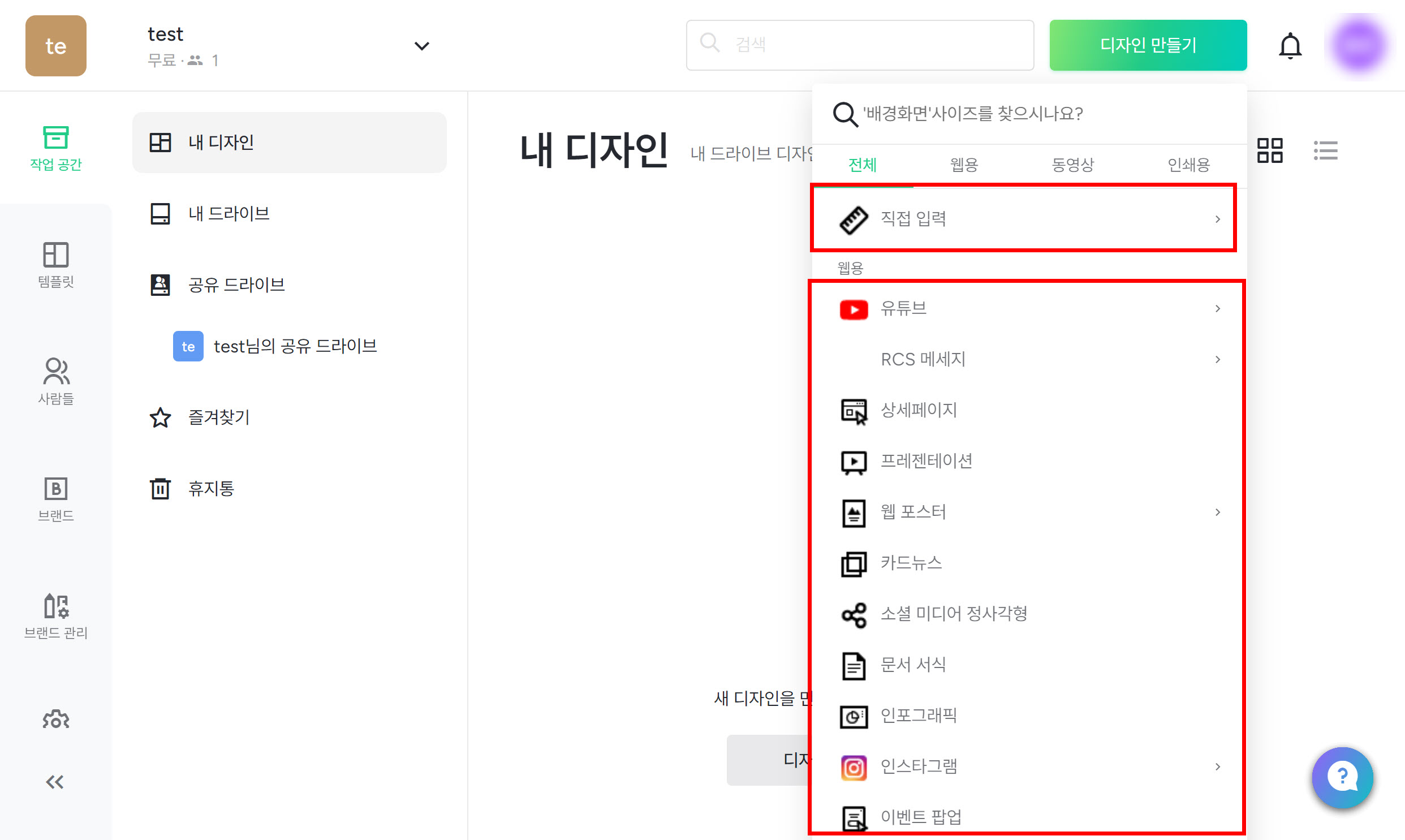 4)디자인 만들기에서 사전 설정된 배경화면 사이즈를 선택합니다(웹용, 동영상, 인쇄용, 직접입력)