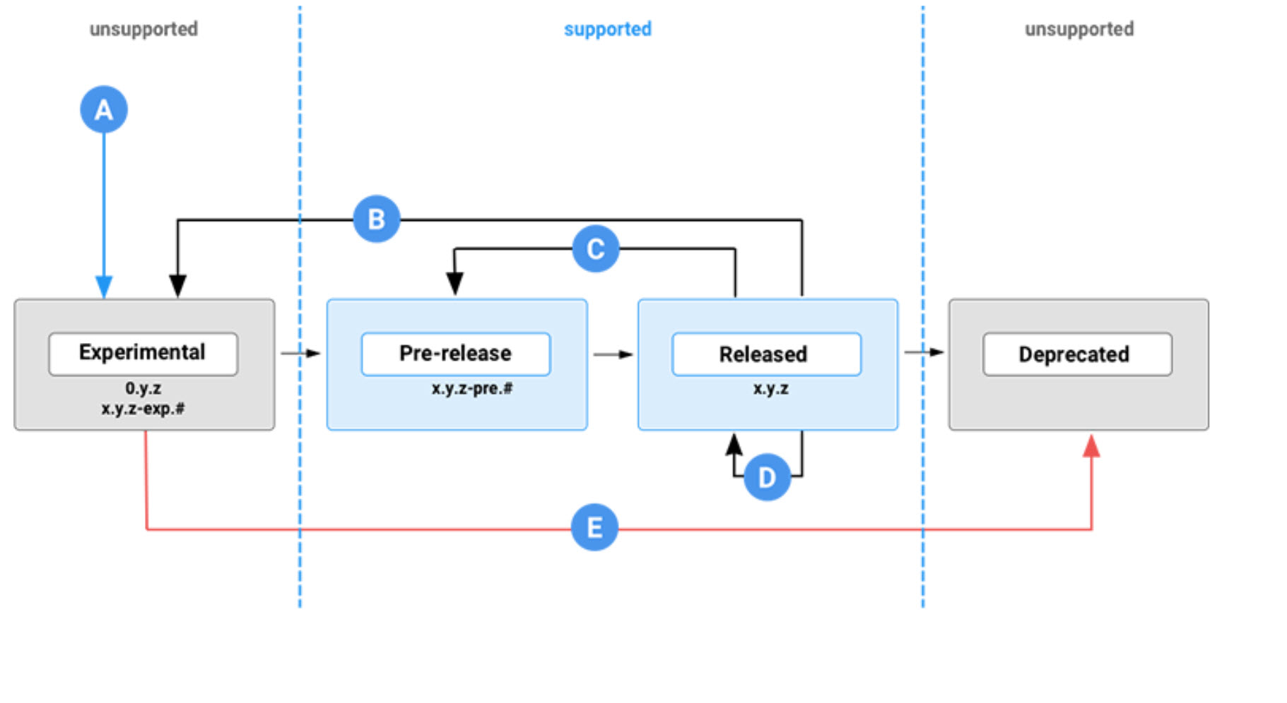 유니티 에디터 버전 2021.1(Unity Editor version 2021.1)부터 패키지는 아래와 같은 수명주기(라이프사이클, lifecycle)을 가집니다.