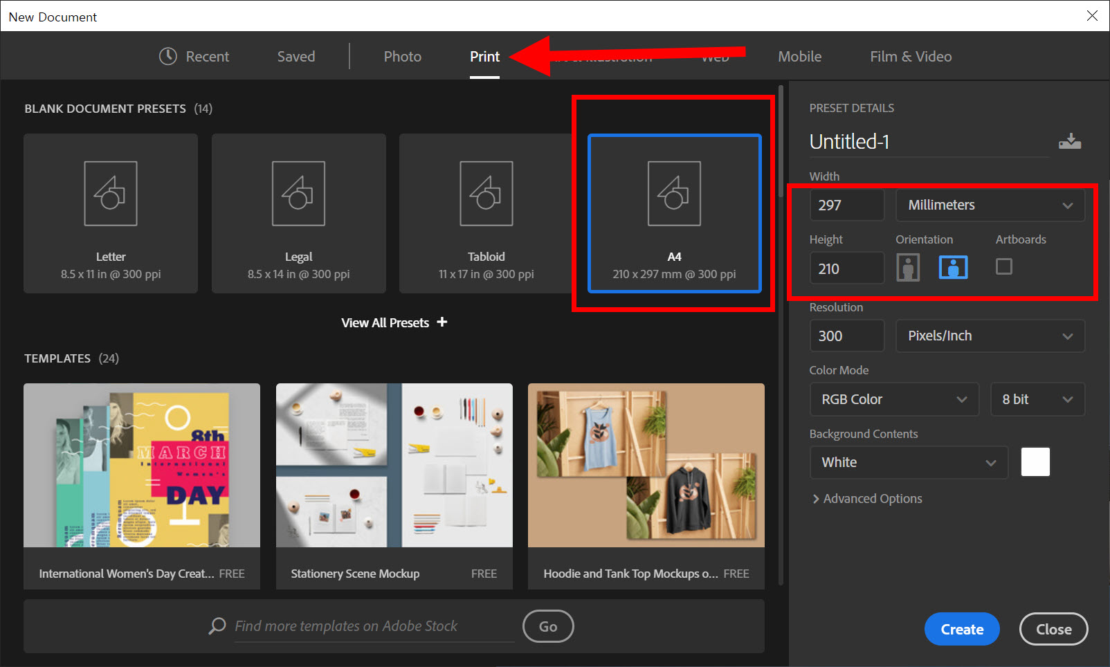 5)포토샵에서 레퍼런스 이미지의 크기를 설정합니다. 예에서 이미지를 A4 규격으로 출력할것임으로 인쇄(print)의 A4( 297 x 210 또는 210 x 297) 프리셋을 선택하였습니다.
