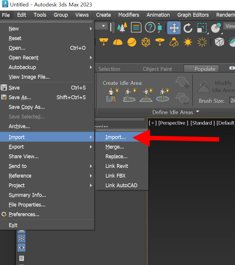 9)3D맥스를 실행하고 상단의 file 메뉴에서 import의 import를 선택합니다. 포토샵에서 내보내기한 AI파일을 선택합니다.