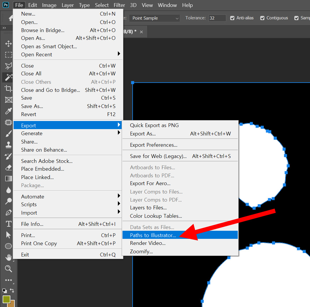 7)상단의 file 메뉴에서 export의 paths to illustrator를 선택합니다.