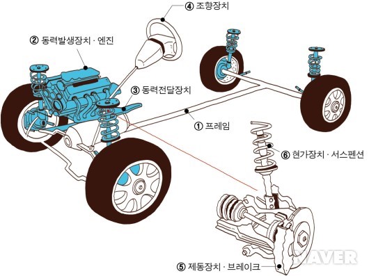 프레임(frame), 동력발생장치(엔진, engine), 동력전달장치(power train), 조향장치(steering), 제동장치(brake), 현가장치(서스펜션, suspension)