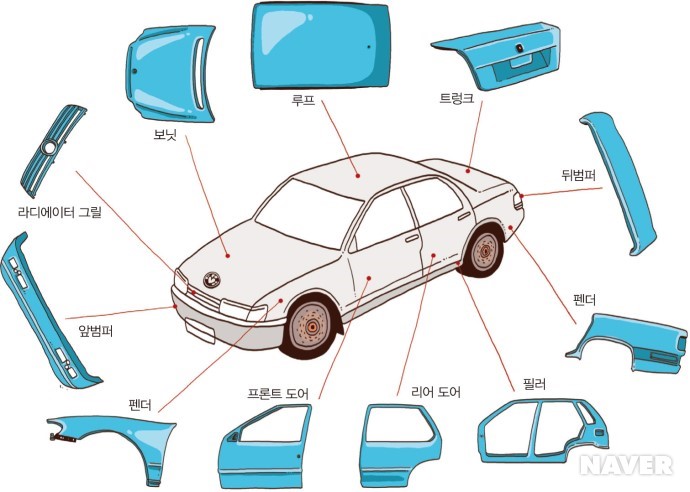 앞범퍼, 펜더, 프론트도어, 리어도어, 필러, 펜더, 뒤범퍼, 트렁크, 루프, 보닛, 라디에이터 그릴