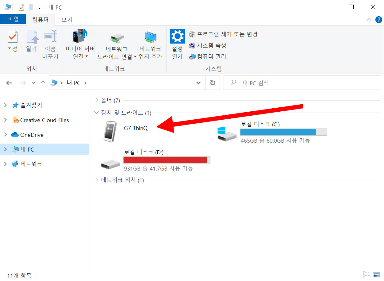 6)컴퓨터의 내PC 장치 및 드라이브에서 연결된 스마트폰 장치를 표시합니다.