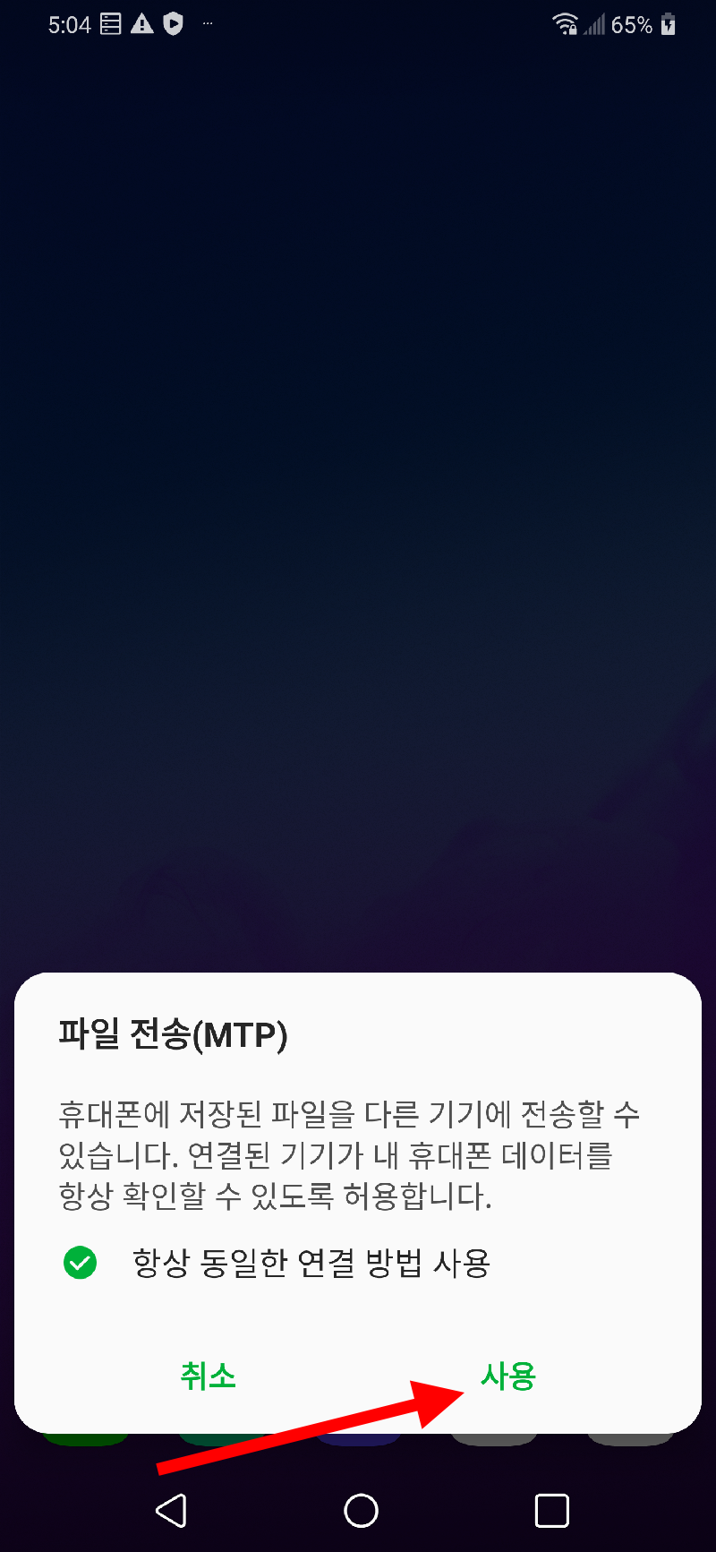 5)컴퓨터, 스마트폰 재부팅을 완료하면 USB 케이블을 사용하여 스마트폰을 컴퓨터에 연결합니다. 스마트폰에서 파일 전송(MTP) 사용을 선택합니다.