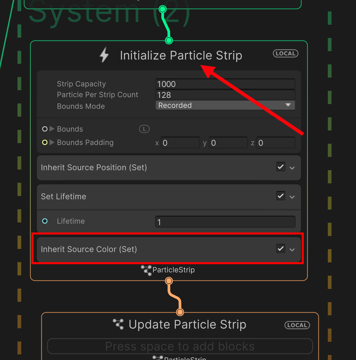 7)initialize particle strip에서 inherit source position와 set lifetime을 추가하여 파티클(source)의 위치를 상속하고 파티클스트립(particle strip)의 수명을 설정합니다.