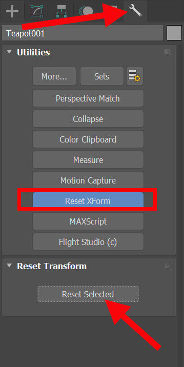 8)utilities의 rset XForm을 선택하고 reset selected를 클릭합니다.