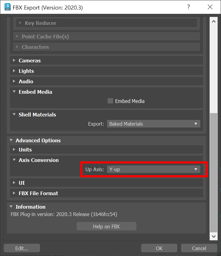 3)FBX 내보내기(export) 옵션에서 axis conversion의 up axis를 확인합니다. 기본 옵션 Y-up을 선택하고 확인합니다.