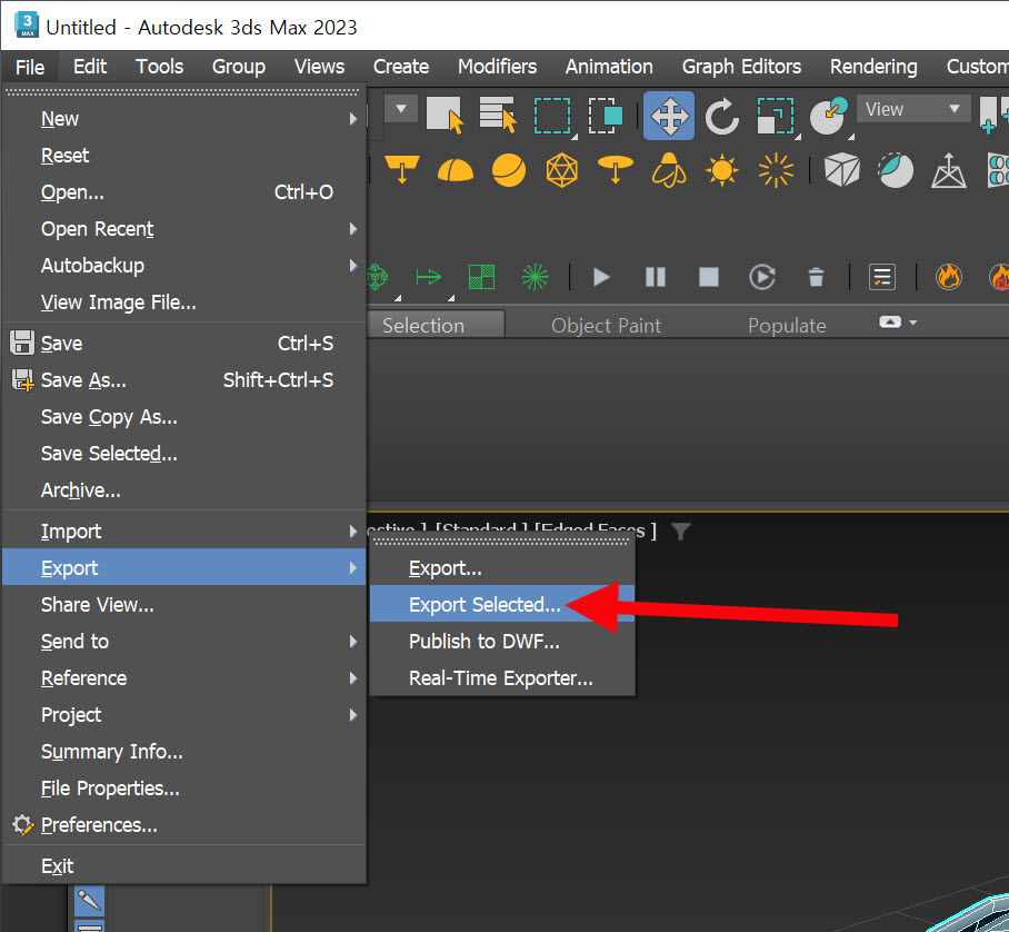 2)상단의 file 메뉴에서 export의 export selected를 선택합니다(fbx 파일형식)