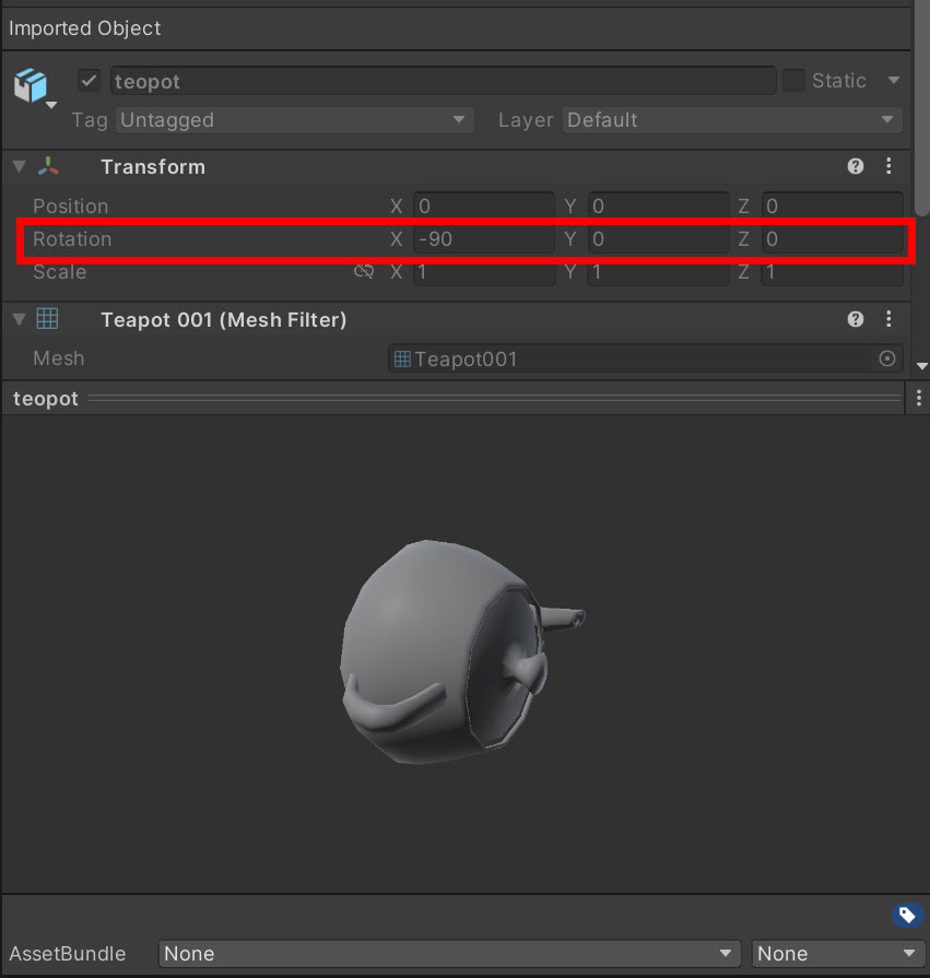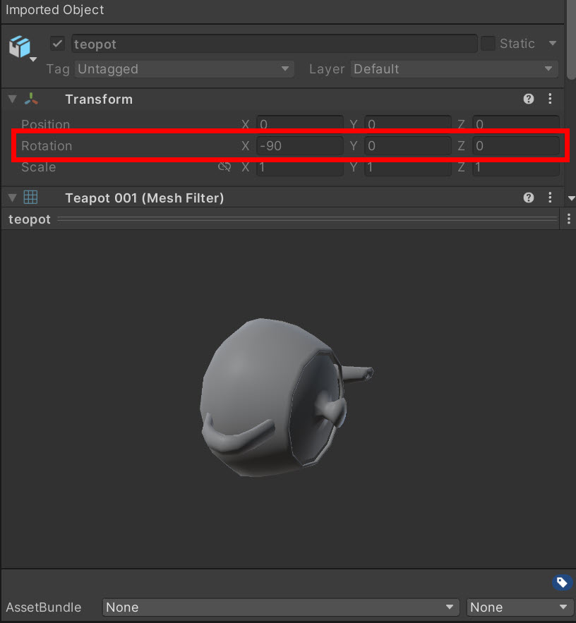 가져오기한 3D 모델의 회전이 설정되어있는것을 확인할수있습니다.