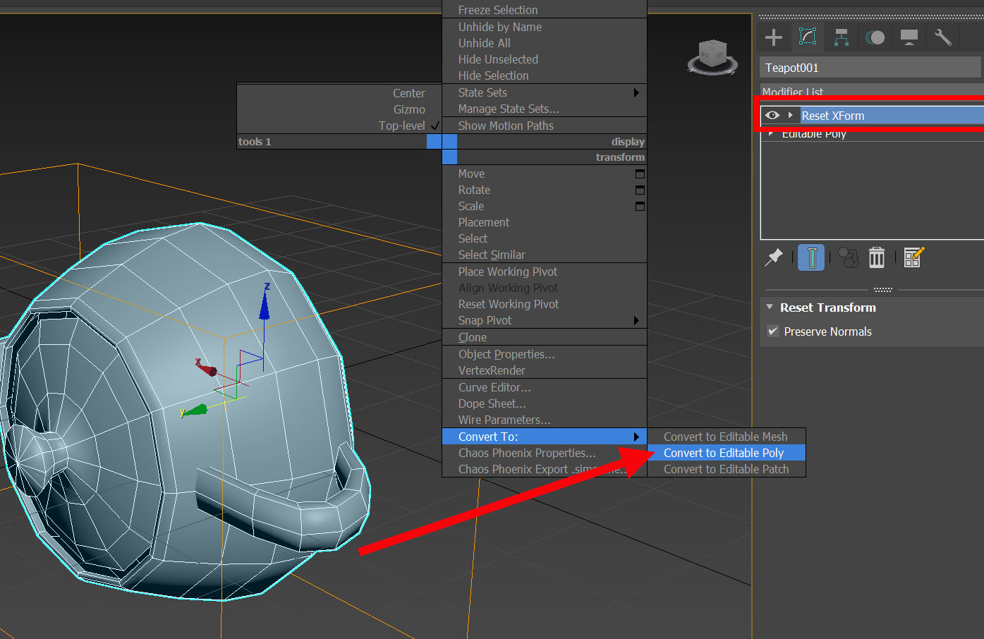 9)reset XForm 수정자가 추가된것을 확인할수있습니다. 마우스 우클릭 메뉴에서 convert to editable poly를 선택하여 오브젝트의 트랜스폼을 초기화합니다. 3D 모델을 내보내기합니다(fbx)