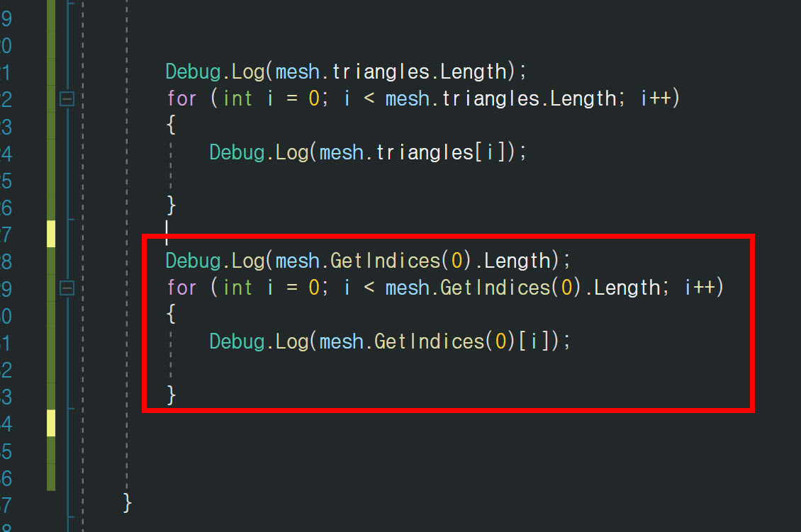 7)GetIndices 함수에서 인덱스를 사용하여 특정 하위 메시(submesh)를 구성하는 모든 삼각형 배열의 크기와 삼각형을 출력합니다.