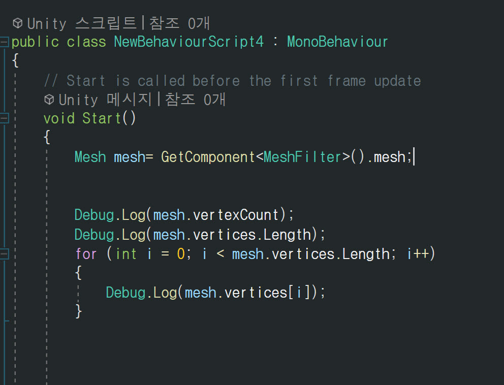 3)메시의 정점 개수(vertexCount, vertices.Length)를 출력하고 정점의 위치를 출력합니다.