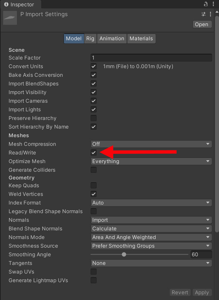2)모델의 가져오기 설정(import settings)에서 read/write를 체크하고 적용합니다(apply)