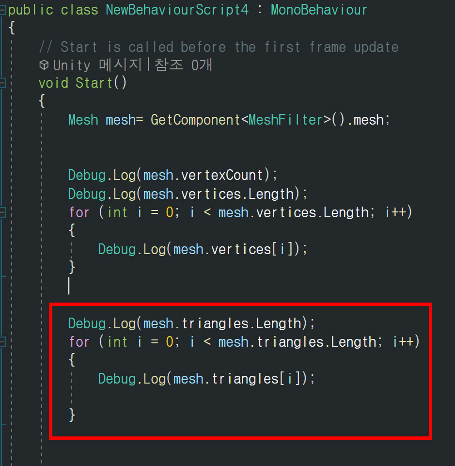 5)메시를 구성하는 모든 삼각형 배열의 크기(triangles.Length)와 삼각형을 출력합니다.