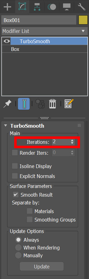 2)오브젝트에 turbosmooth 수정자를 추가하고 iterations 수치를 입력합니다.