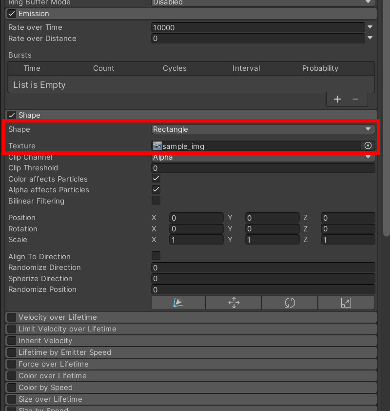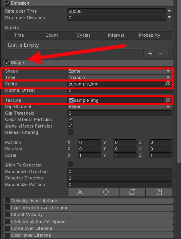 4)sprite shape의 경우 shape 모듈에서 shape(sprite)과 type(triangle)을 선택합니다. sprite에 스프라이트를 참조하고 texture에 텍스처 이미지를 참조합니다.