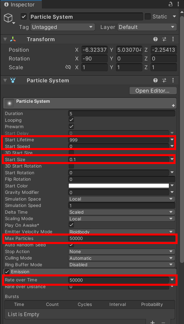 2)파티클시스템의 속성을 설정합니다(start lifetime, start speed, start size, max particles, emission rate over time)