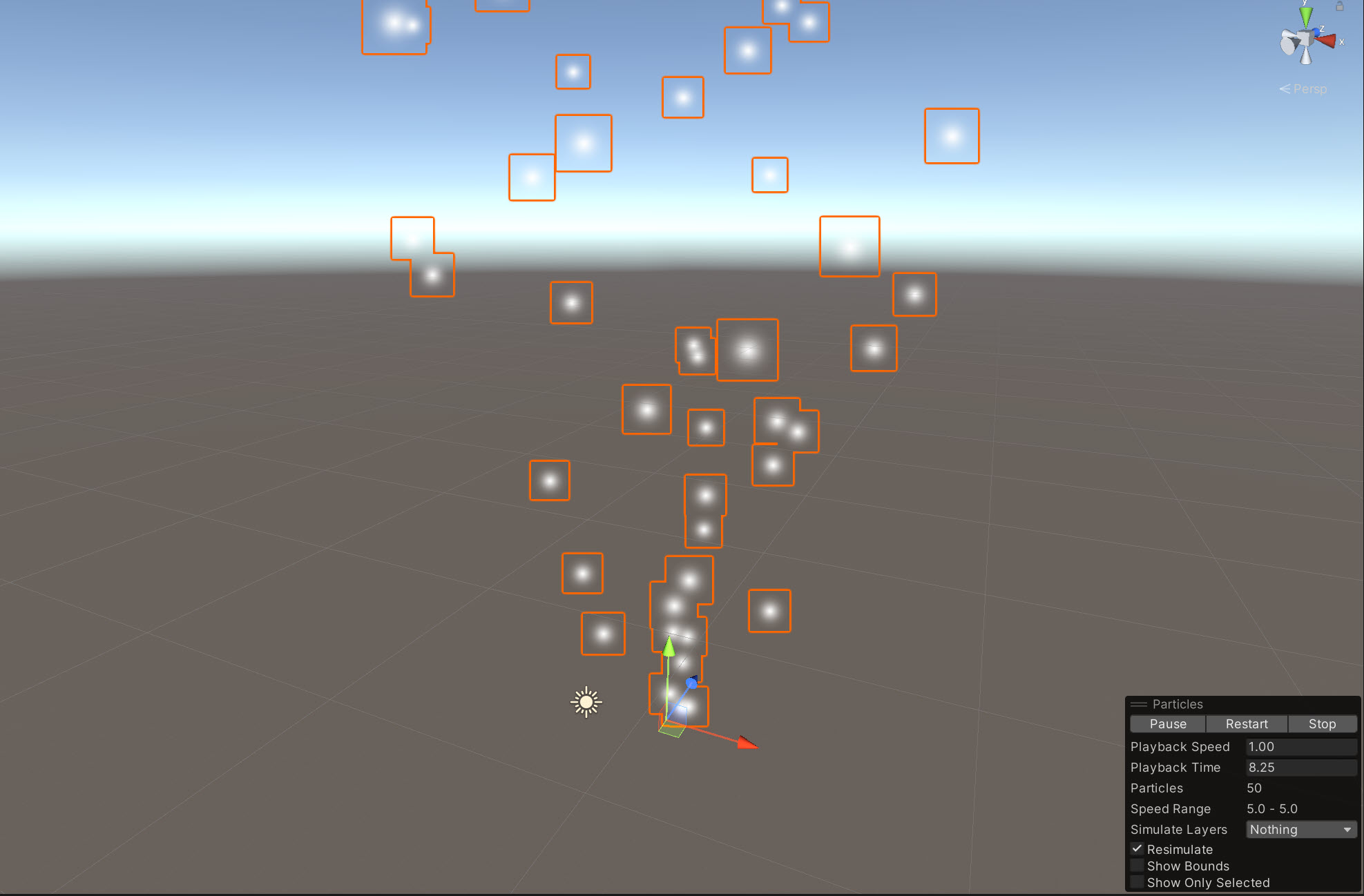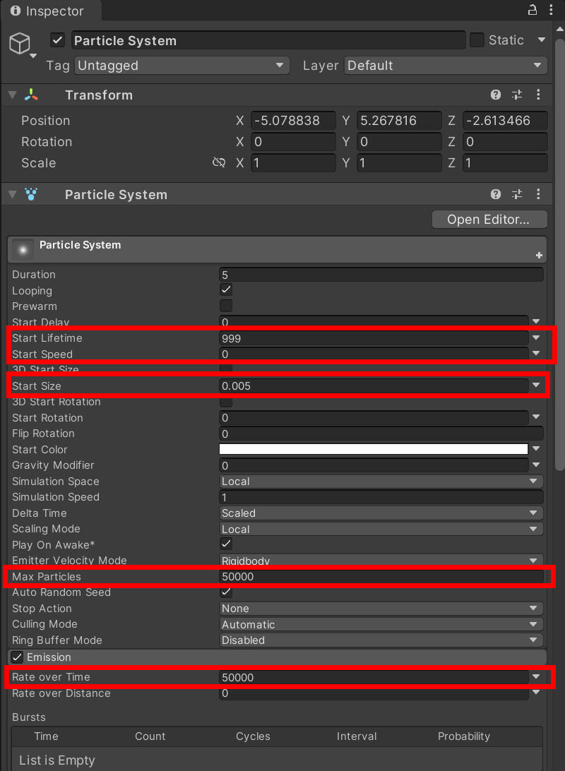2)파티클시스템의 속성을 설정합니다(start lifetime, start speed, start size, max particles, emission rate over time)