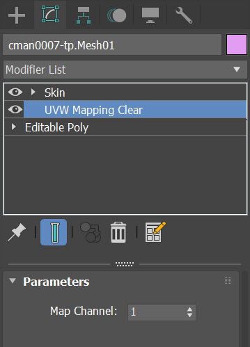 8)UVW Mapping Clear 수정자를 Skin 수정자 하위에 위치시킵니다.