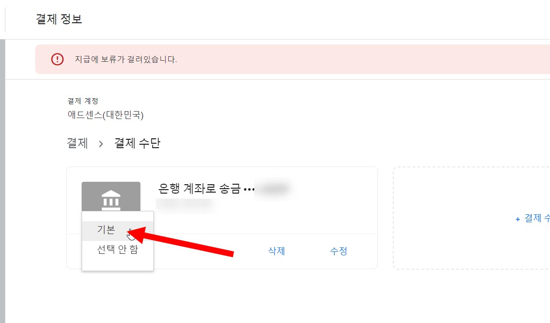 2)결제 정보가 등록되어있지 않은경우 상단에서 지급에 보류가 걸려있습니다 문구를 확인할수있습니다.