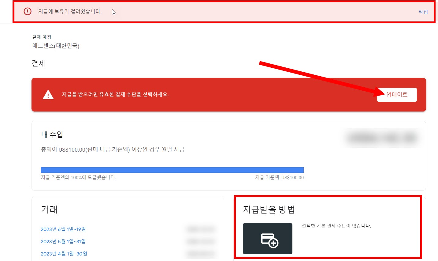 결제 수단 업데이트가 안되는 경우 결제 정보 메뉴 상단에서 여전히 지급에 보류가 걸려있습니다 문구와 지급을 받으려면 유효한 결제을 선택하세요 문구를 표시합니다. 또 지급받을 방법에서 선택한 기본 결제수단이 없습니다를 표시합니다.