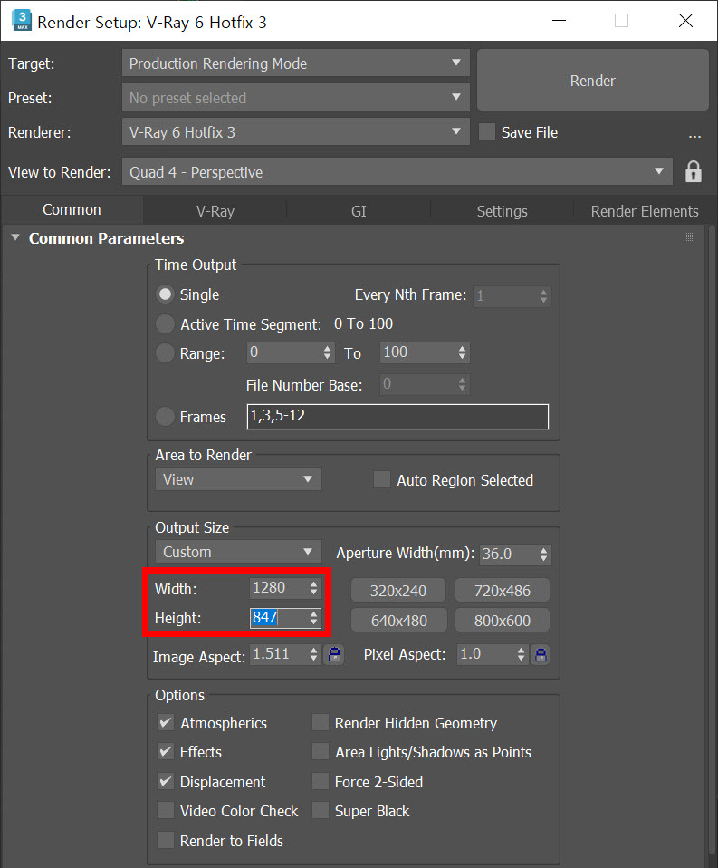 3)렌더 설정(render setup)에서 이미지와 동일한 크기의 렌더링 해상도를 설정합니다.