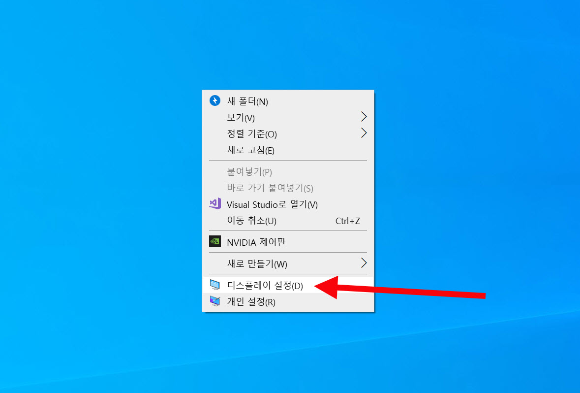1)바탕화면에서 마우스 우클릭 메뉴에서 디스플레이 설정으로 이동합니다.