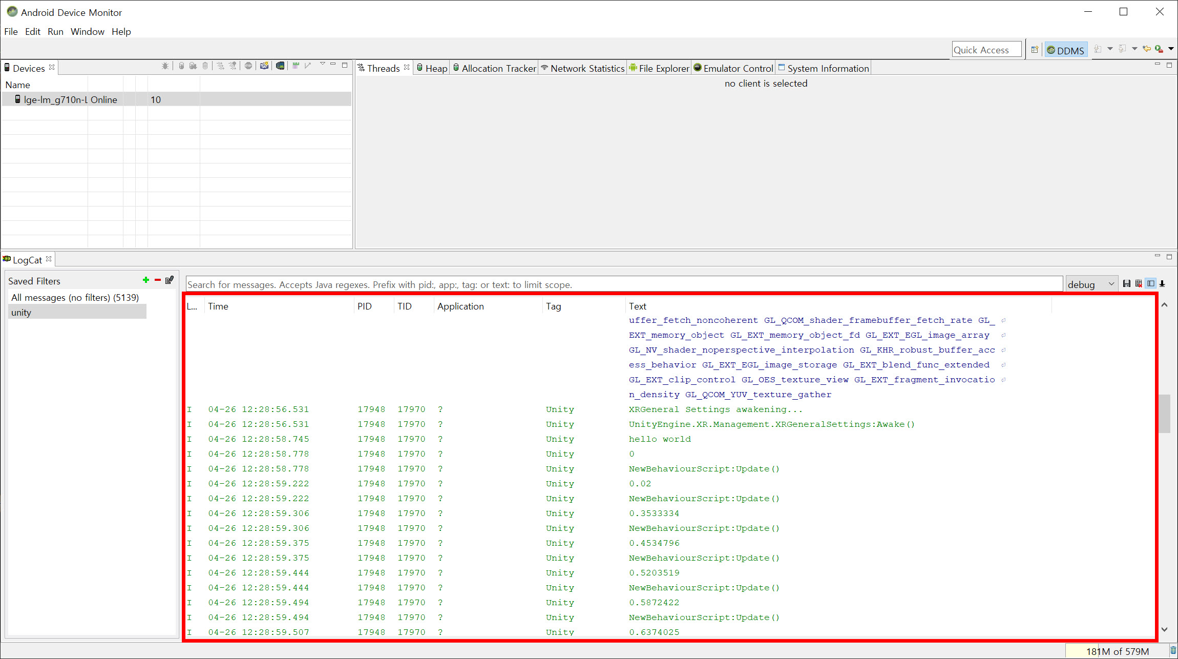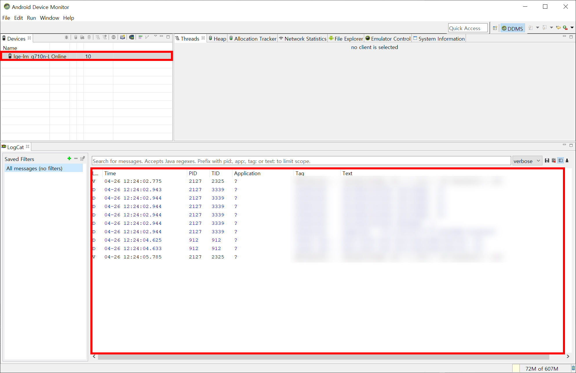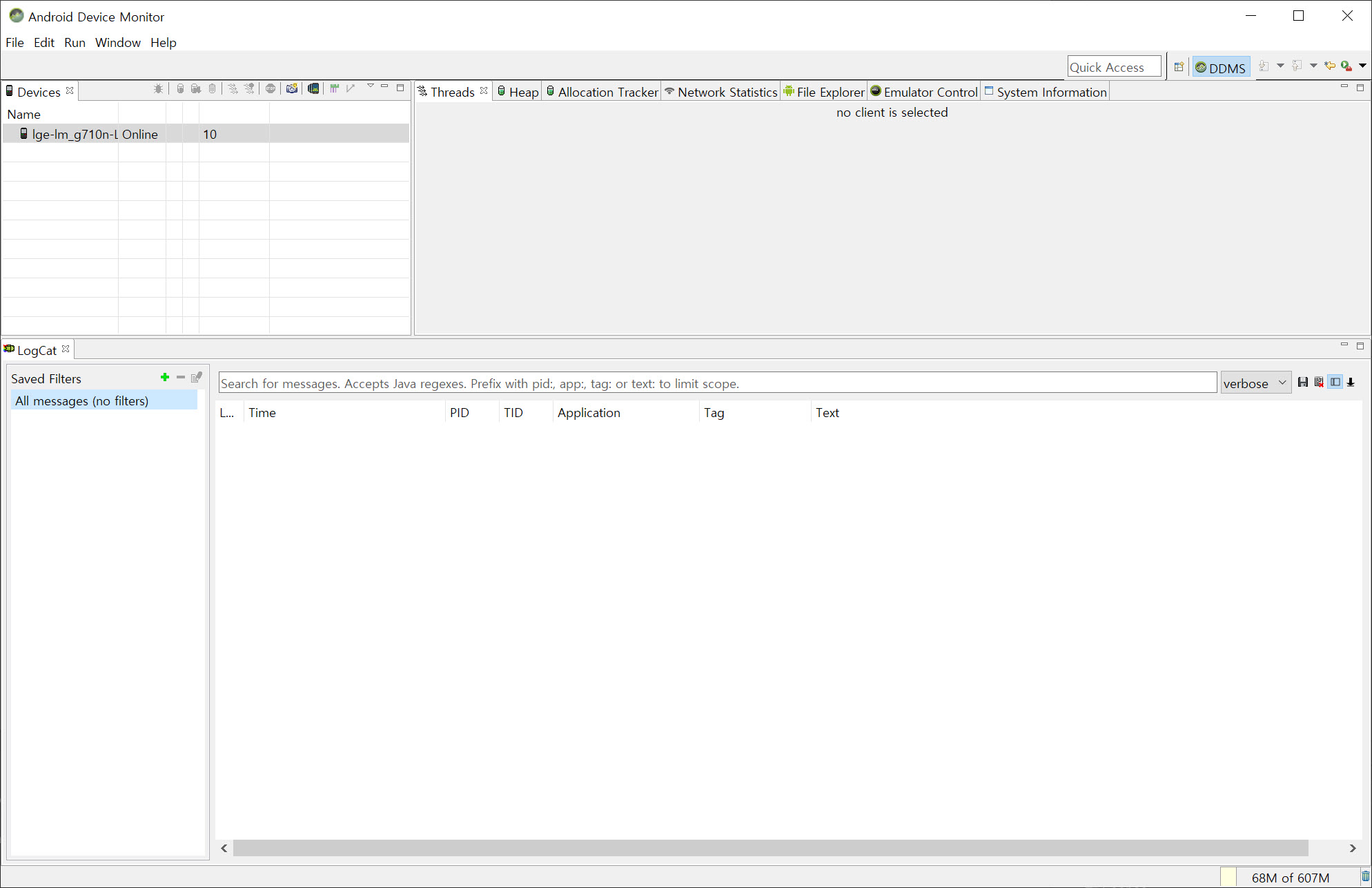 2)Devices에서 현재 연결된 장치를 표시하고 LogCat에서 메시지(messages)가 표시되는것을 확인할수있습니다.