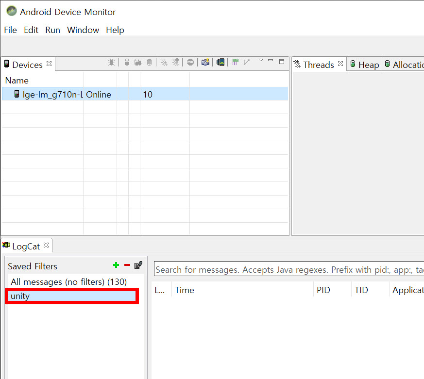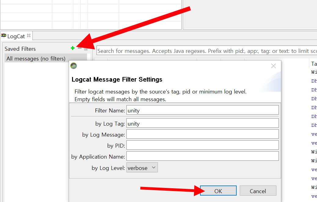 3)LogCat의 saved filters에서 로그캣 메시지 필터 설정으로 이동합니다. filter name, by log tag에 unity를 입력하고 확인합니다.