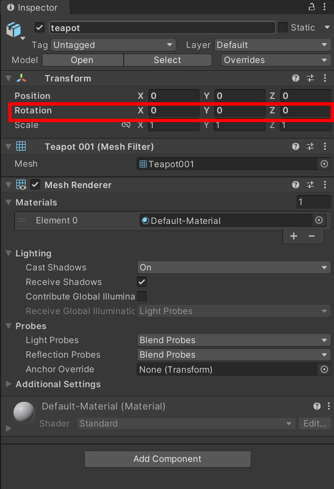 5)씬에 모델을 추가하고 확인합니다. 오브젝트의 트랜스폼 회전(rotation)값이 초기화(0, 0, 0)되어 있고 축이 정상적으로 설정되어있는것을 확인할수있습니다.