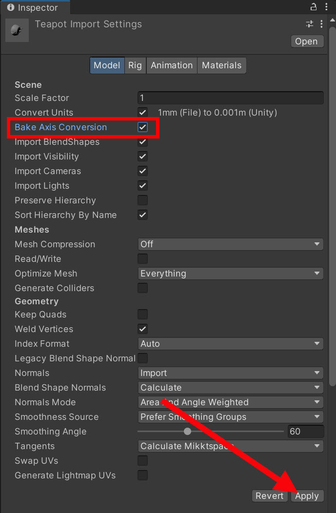 4)모델의 가져오기 설정(import settings)에서 bake axis conversion에 체크하고 적용합니다(apply)