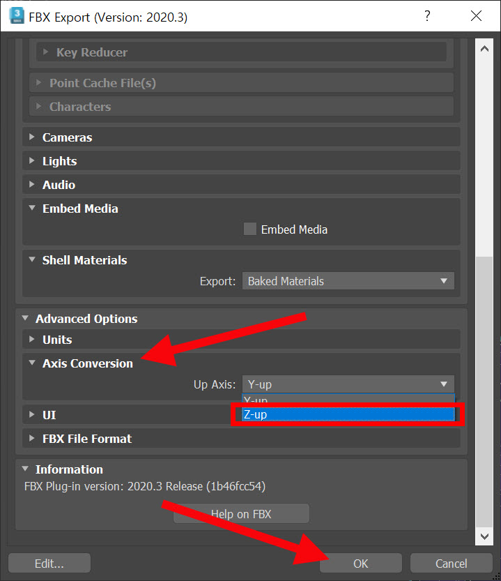 2)FBX export 옵션의 advanced options에서 axis conversion의 Up Axis를 Z-up으로 변경하고 내보내기합니다(export)