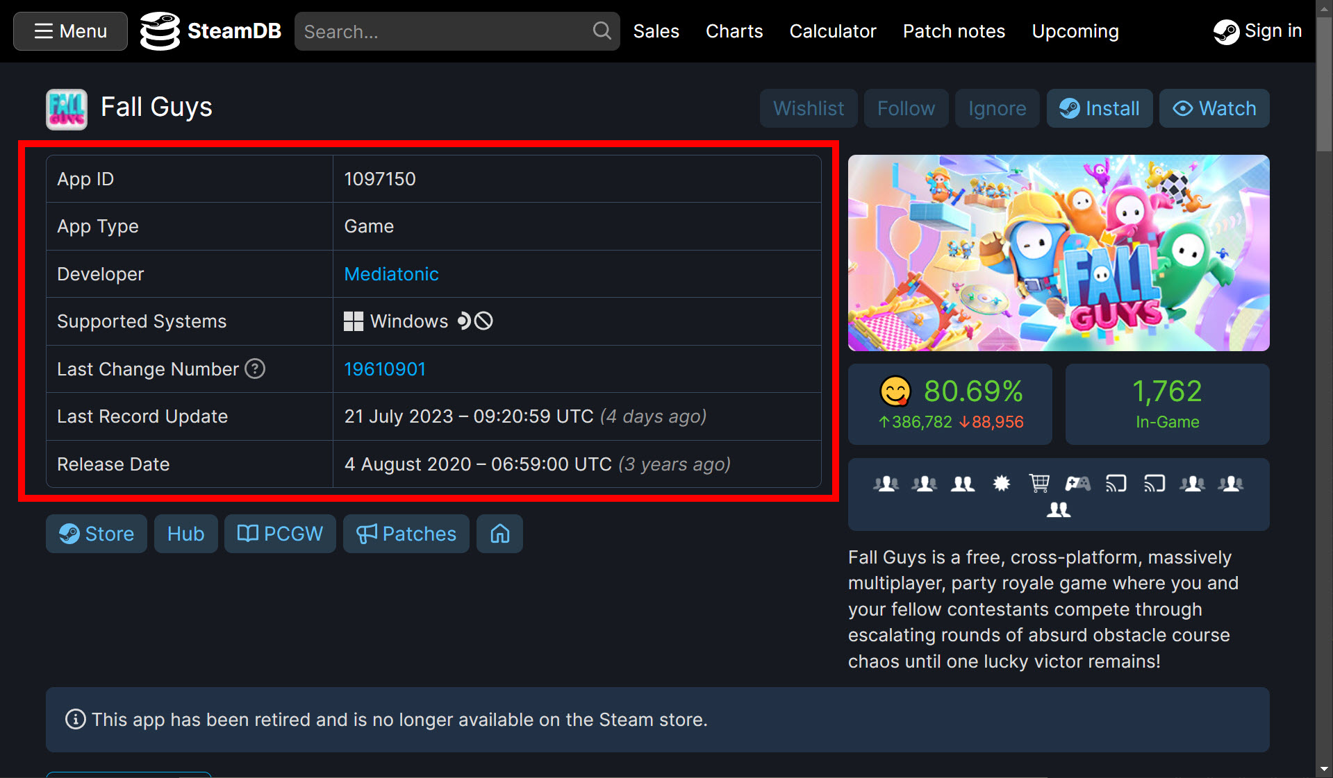 3)게임에 대한 정보를 확인할수있습니다(앱ID, 앱 유형, 개발자, 지원 시스템, 마지막 업데이트, 릴리즈 날짜)