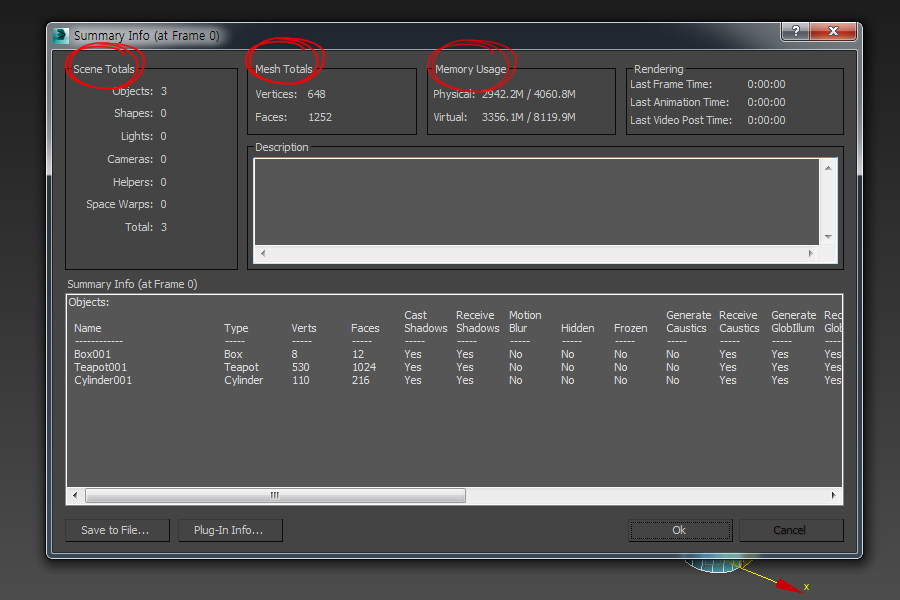 현재 씬에 존재하는 전체 오브젝트 개수(scene totals - objects, shapes, lights, cameras, helpers, space warps), 정점과 면의 총 개수(mesh totals - vertices, faces), 메모리 사용량, 렌더링, 기타 확인하기