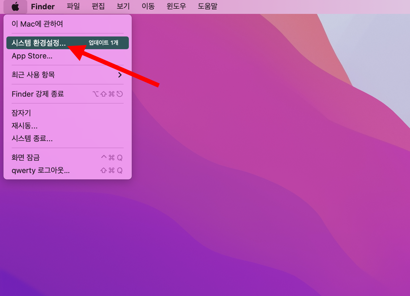 1)상단의 애플 메뉴에서 시스템 환경설정으로 이동합니다.