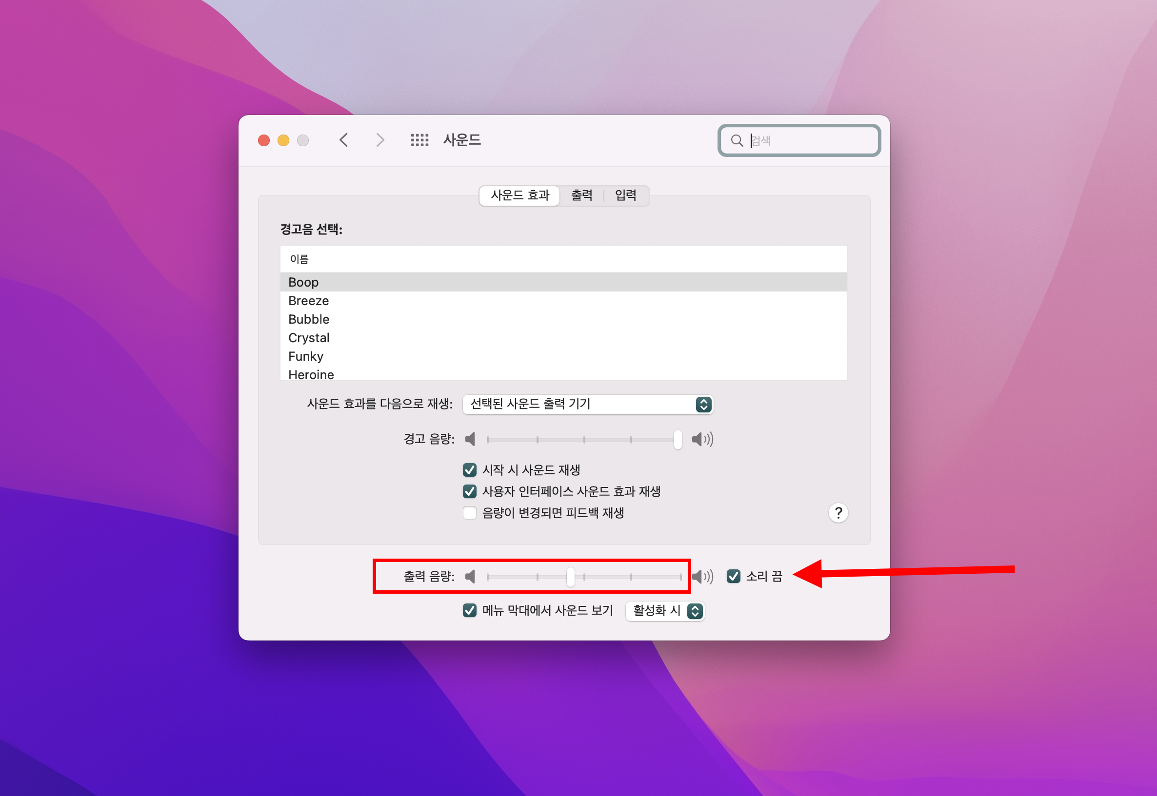 3)출력 음량에서 사운드의 음량을 조절합니다. 사운드를 제거하려면 소리 끔에 체크합니다.